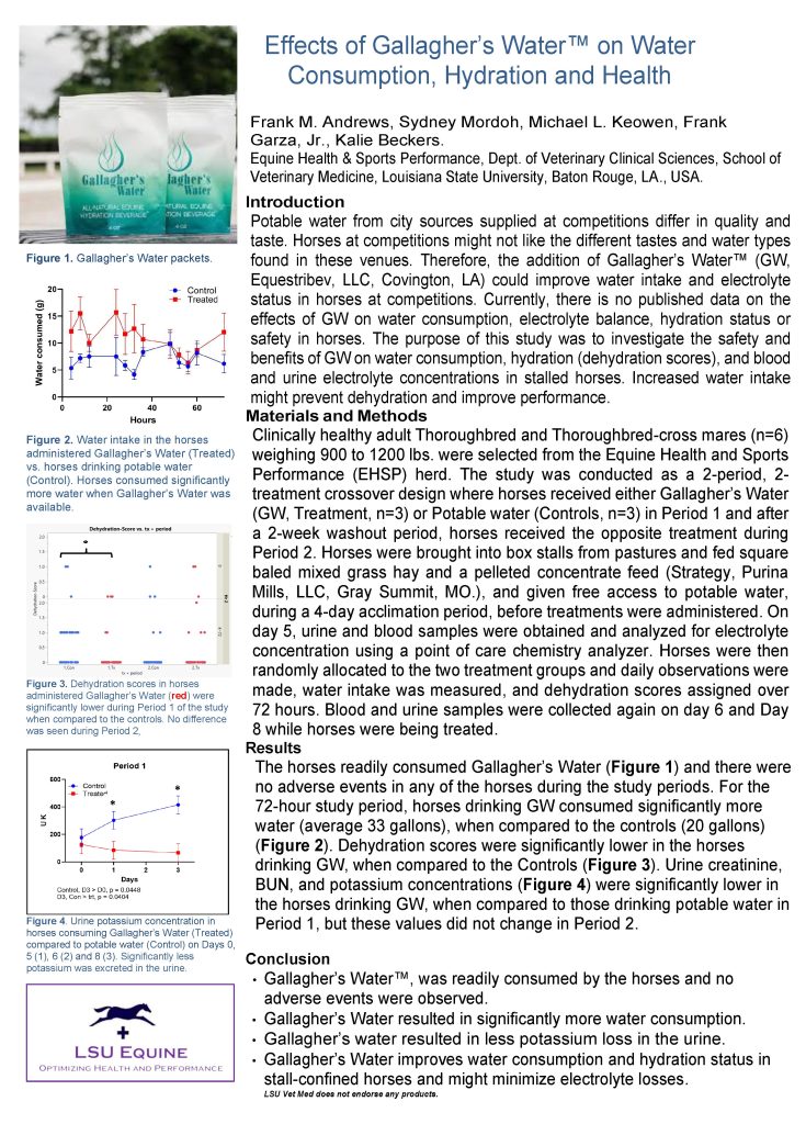 Louisiana State University recently completed a study on Gallagher’s Water to test its effectiveness in getting horses to consume more water. The study entitled Effects of Gallagher’s Water™ on Water Consumption, Hydration and Healthconcluded the following: